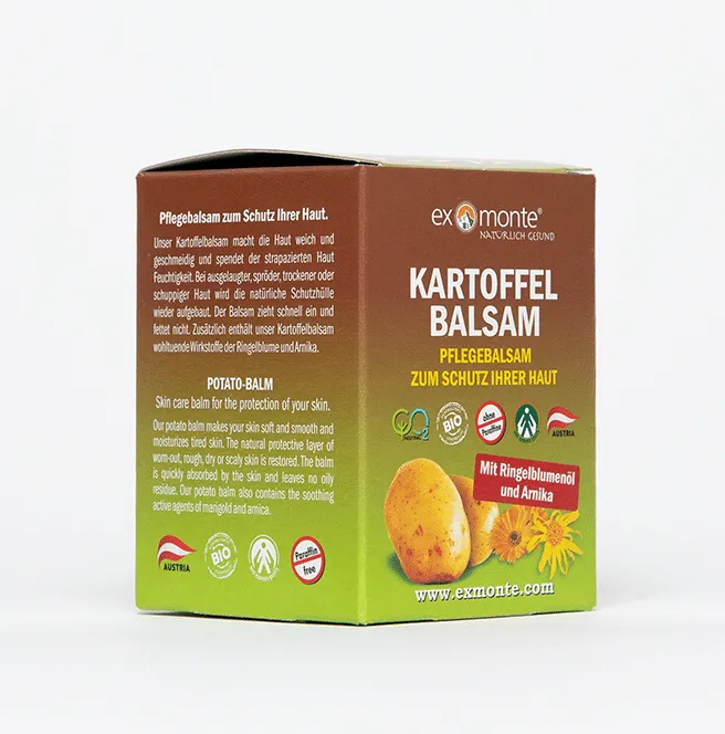 Unser Exmonte Kartoffelbalsam ist ein hochwertiger Pflegebalsam aus der Naturkosmetik, der speziell für trockene, spröde und beanspruchte Haut entwickelt wurde. Die wirksame Kombination aus Kartoffelextrakt, Ringelblumenöl und Arnika unterstützt die natürliche Regeneration der Haut, spendet intensiv Feuchtigkeit und macht sie wieder weich und geschmeidig.